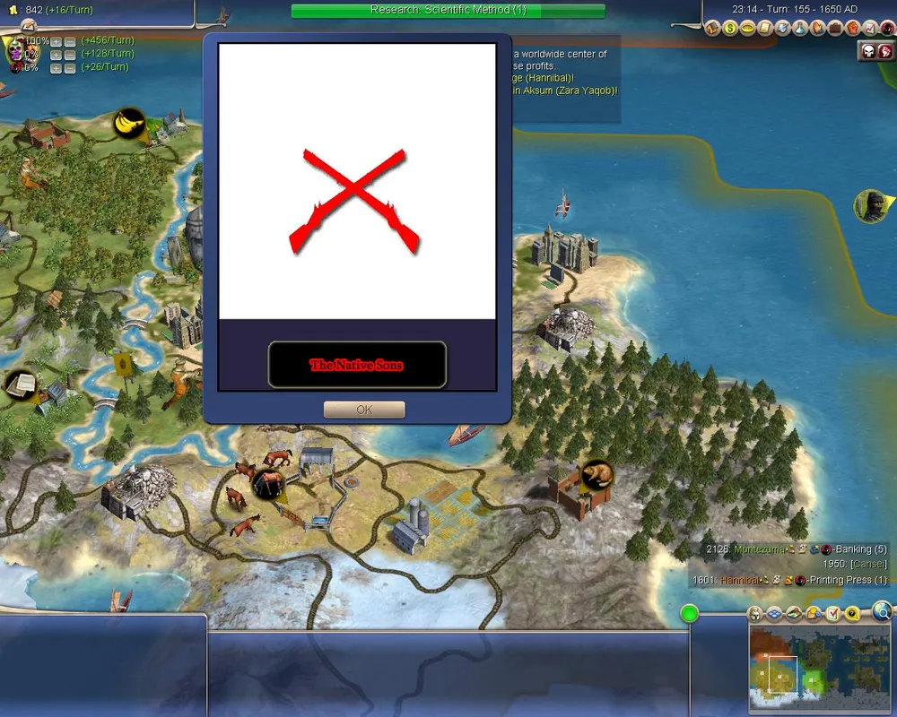 Действует 8 ходов, дает прибавку к уровню золота во все ваши города. Эффект зависит от количества туземных общин на вашей территории. Увеличивает шанс радикализации нац. меньшинств.