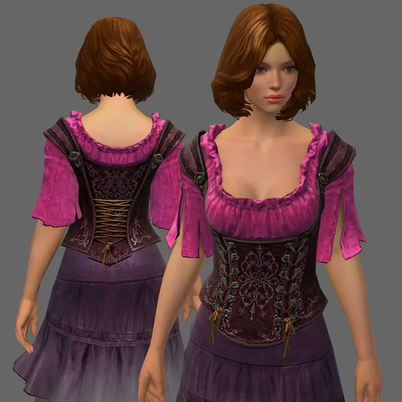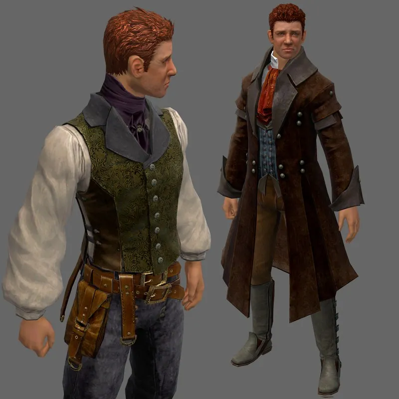 Люди, наверное, самая знакомая и гибкая в дизайне раса, ведь они носят практически что угодно. Но выбрать из определённых временных периодов - это лишь начало. И хотя у Divinity's Reach свой особый вкус, это всё равно фентези, поэтому мои методы направлены больше на создание смеси убедительного и функционального, но с уникальным оттенком. Например, жители могут носить жилет, сторона у которого разделена и застёгивается, а воротник из кожаных лент. Пальто может быть не просто обычным длинным мужским пальто, но и включать в себя элементы тренча (разбойничьего дождевого плаща), и быть выполненным с двубортными пуговицами в стиле торжественной одежды. Пояса - мои любимчики, обожаю моделировать узлы - и всегда наматываю их вокруг штанов.