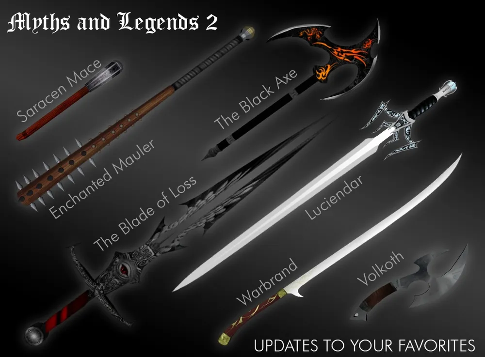 Myth and Legends добавляет на просторы Сиродила более десятка новых предметов (оружие), каждый со своей уникальной историей! Все они описаны в нескольких томах книги "Мифы и Легенды", найти которые вы сможете у книжных торговцев во всех крупных городах.