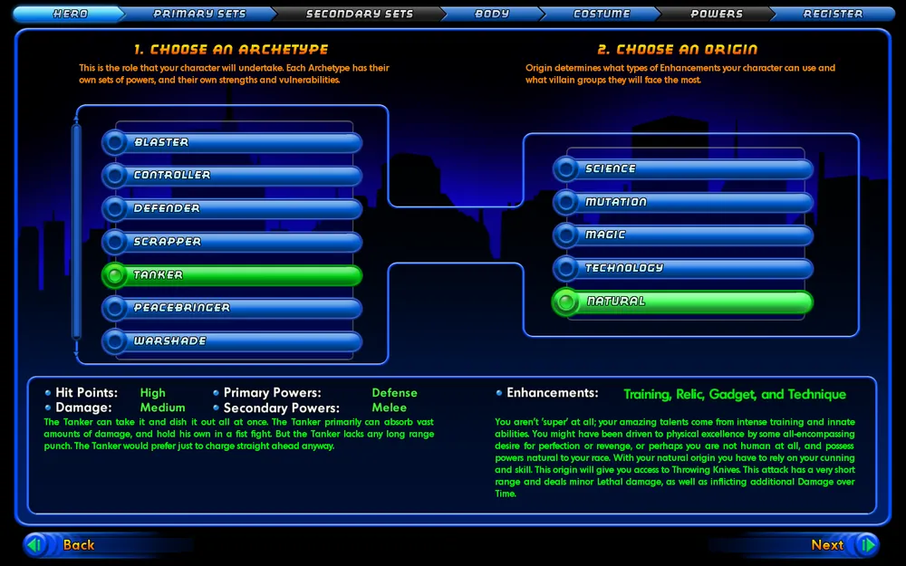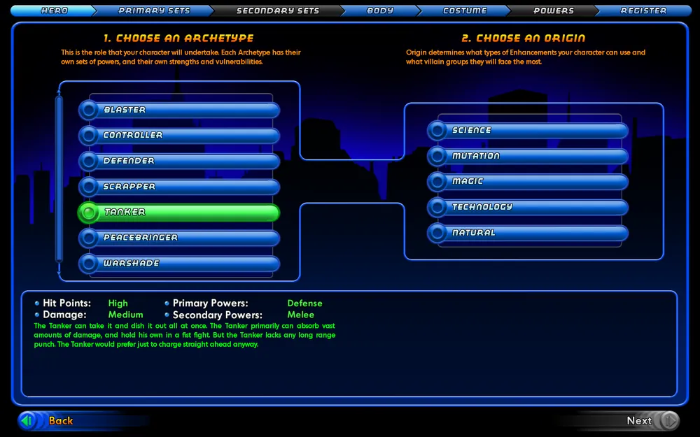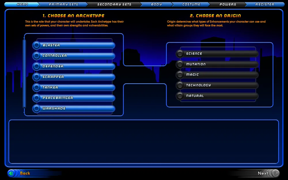 Вот тут я решил, что буду играть за героя. Но все оказалось, не так просто. Мне предложили на выбор 5 архитипов (+ еще 2 эпических архитипа, которые становятся доступны после того, как какой нибудь из персонажей достигнет 20 уровня). И у каждого были свои плюсы и минусы. Так же дали на выбор 5 происхождений. После выбора архитипа и происхождения, дают выбрать первичные и вторичные системы навыков.