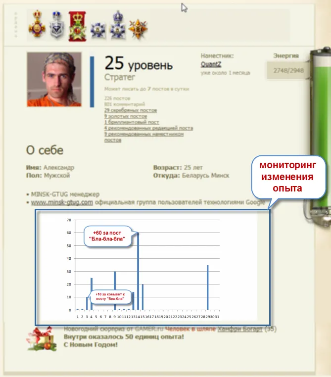 И вот, в один их таких периодов, например после отсутствия на сайте более 3-5 дней, я захожу (повторяю, например) и вижу, что опыт скаканул аж на 50 пунктов.