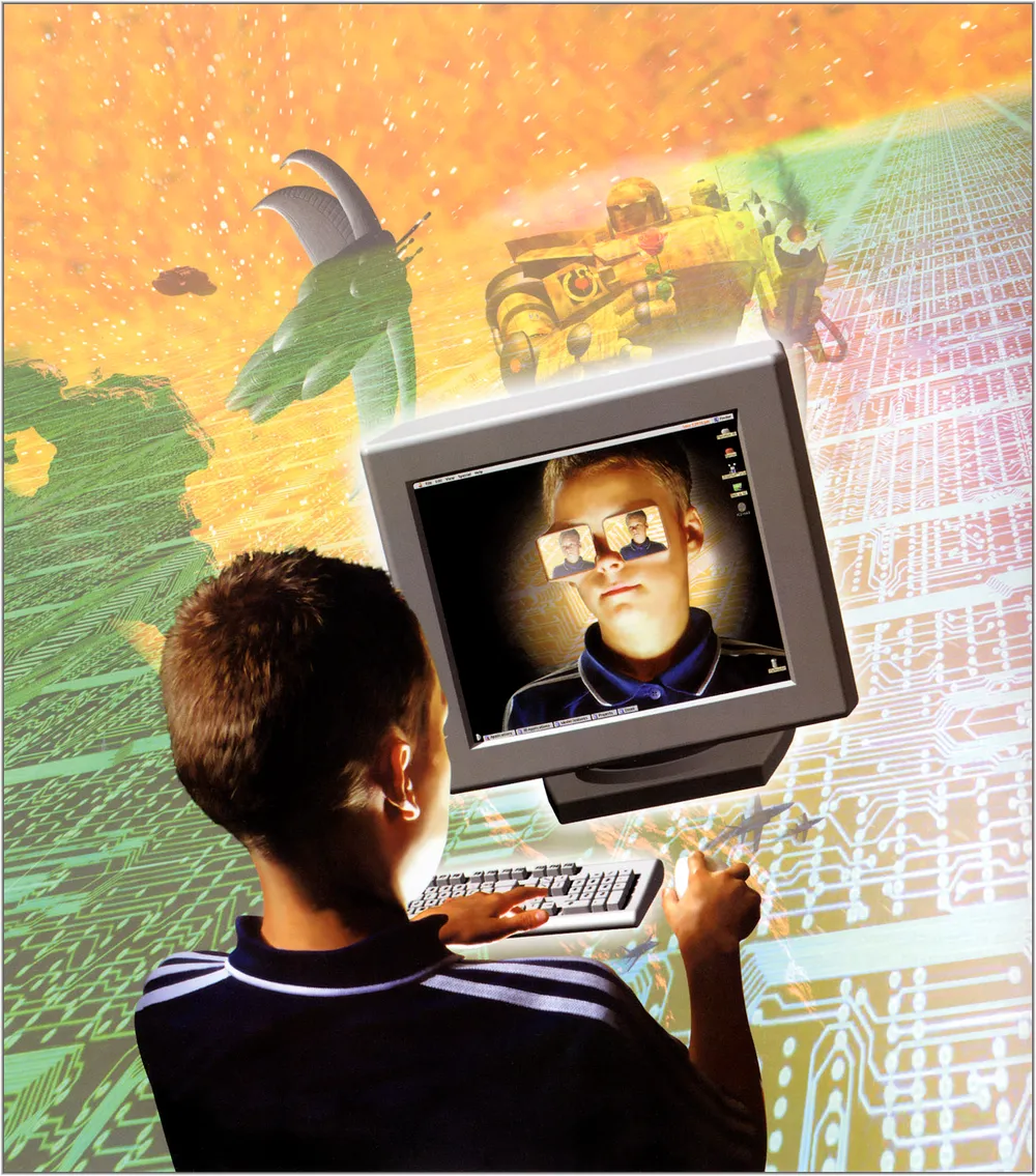 Зоуи улеглась в своё школьное кресло и надела очки голобенда. Перед ней в виртуальном пространстве пробежалась рекламная заставка фирмы-производителя, и началась загрузка «школьной аудитории». Перед её взором посреди пока пустой ”школьной” комнаты появился мужской образ, который, казалось, обратился прямо к ней: