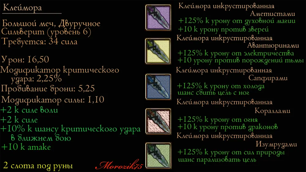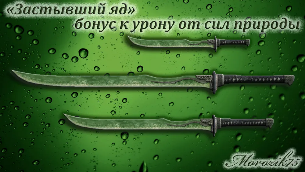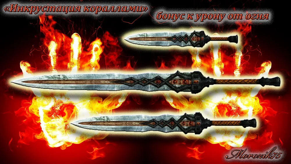 Теперь давайте расскажу вам ГЛАВНУЮ особенность этого мода. Как ни странно, это вовсе не красивые клинки. Мод МЕНЯЕТ ГЕЙМПЛЕЙ!!! Прошу это учесть. Итак, как же это происходит. Дело в том, что в игре есть такая характеристика «бонус к урону стихийной магией» (например. огонь или холод). Так вот смысл от неё такой, если вы зачаруете меч наносить дополнительный урон +2 огнём или отравите кинжал сильным ядом на +5 к магии духа, то в зависимости от величины «бонуса к урону стихийной магией» ваше оружие получит дополнительное повреждение. Это думаю всем и так понятно (кто играл конечно).