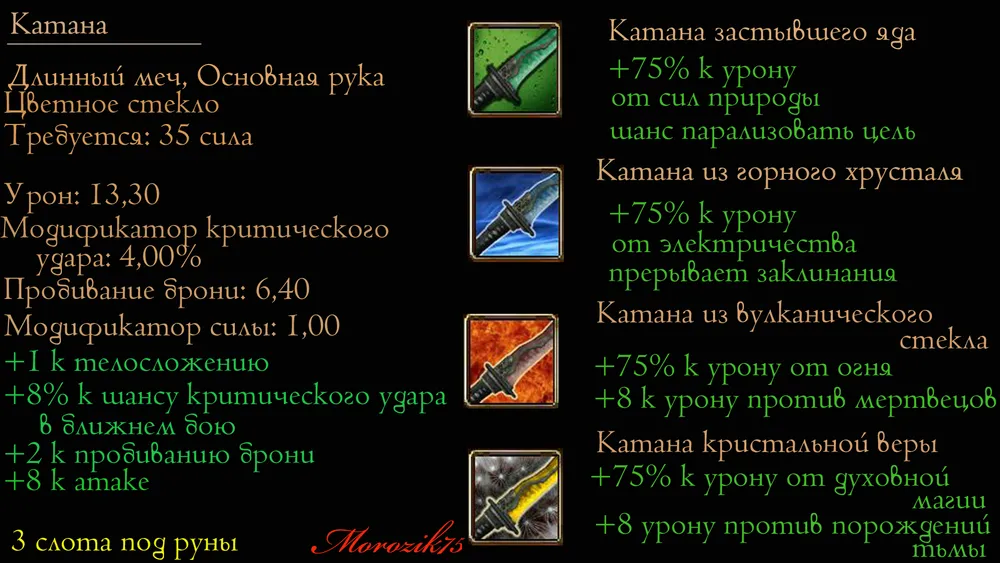 Если ваш персонаж возьмёт в 2 руки предметы с одинаковым эффектом, например Вакизаши и Катану из Вулканического стекла (или туже Вакизаши и Кинжал инкрустированный Кораллами) бонусы от магии будут складываться! Реально! Вот чтобы ограничить такое я сделал так, что в этом случае кроме самого увеличенного бонуса на вашего персонажа будет действовать штраф на защиту от соответствующей стихии. ( В руках огонь — будет идти штраф к защите от холода и наоборот). Это только в случае, когда вы используете предметы бонусы которых складываются, хотя помимо штрафа ещё идёт бонус к Ловкости(я люблю бой с оружием в каждой руке).
