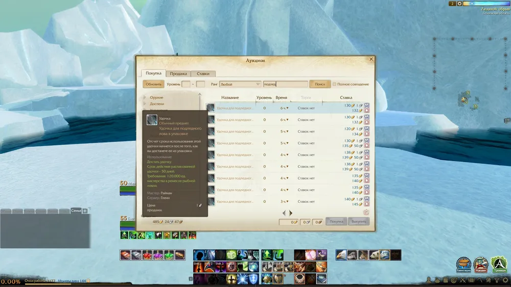 Для рыбаков, чей уровень мастерства достиг 120000, становится доступно использование особой удочки для подледной рыбной ловли. Ходят слухи, что в первые дни такие удочки расходились по баснословным ценам, хотя стоимость их крафта не настолько, по сути, велика. У торговца консорциума за ремесленную репутацию приобретается приблуда, при помощи которой на поверхности земли образуется прорубь, в которой можно безнаказанно рыбачить в течение получаса. В остальном же рыбалка на Леднике не особо отличается от рыбалки в любом другом месте. Разве только цветовая гамма очень бьет по глазам.