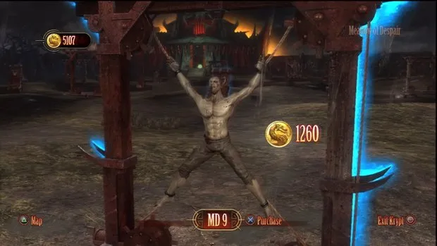 Как вы, должно быть, уже поняли по названию, это место - склеп, наполненный трупами, отчаявшимися душами, узниками, заключенными в разнообразные устройства для пыток, которые только и ждут того, чтобы Вы им что-нибудь оторвали... У каждого тела есть номер и цена. Если у вас достаточно монет (полученных за ladder matches, challenge tower, и single player), то вы сможете открыть действительно клевые вещи: новые Fatality, дополнительные костюмы, концовки Mortal Kombat 9 , а так же кое-что менее ценное - концепт-арт, музыка и др.
