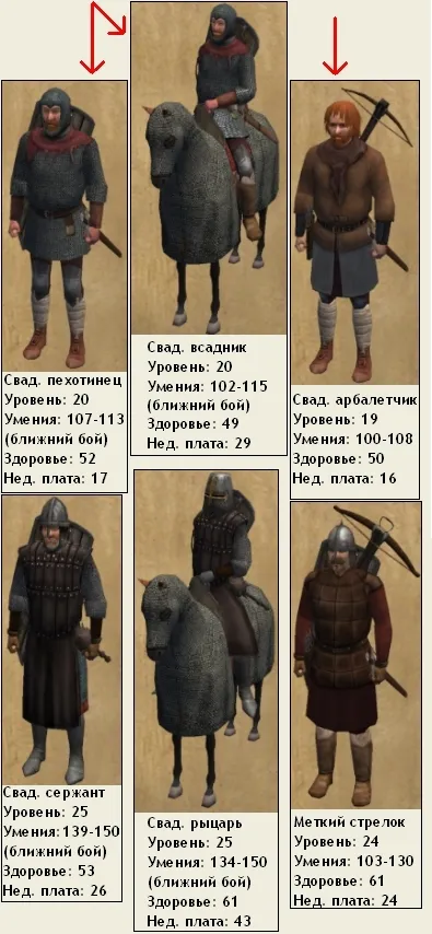 Помимо рекрутов мы можем, как я писал выше, нанимать профессиональных военных в тавернах. Например, конный наемник. Сам по себе стоил сотни монет, в неделю требует еще 64 (таких цен у рекрутов в принципе нет), а по параметрам - 25 уровень, умения 120-140, здоровья 55, броня слабая, конь медленный... единственное преимущество по сравнению с рекрутским набором - его не надо "прокачивать", он уже высокого уровня. Покупаются на старте игры как телохранители или перед угрозой потери города - когда надвигаются полчища врагов каждый конник на вес золота.