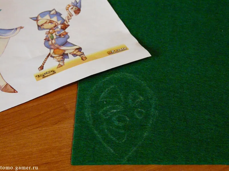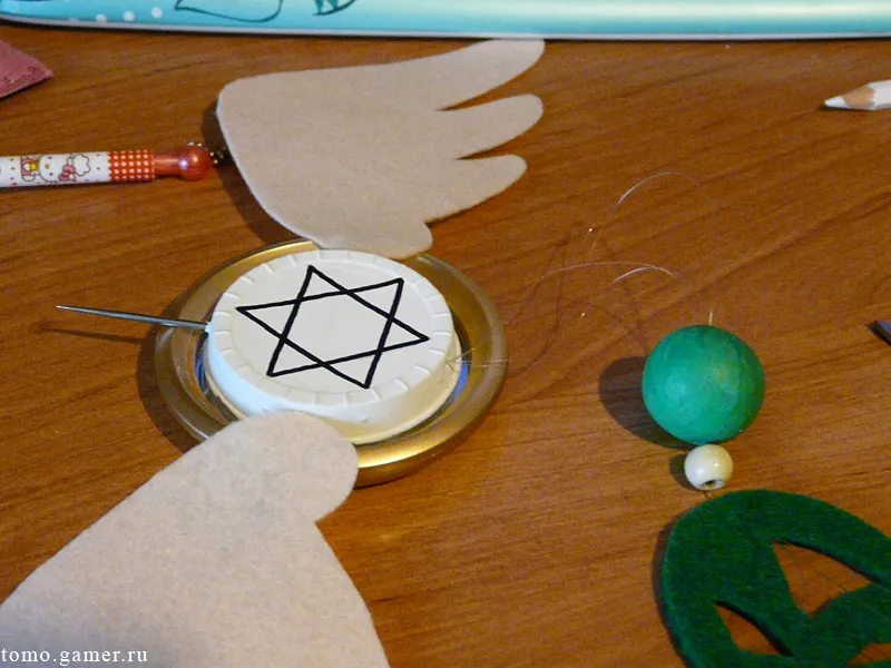 Далее переходим к работе с фетром. Из бежевого вырезаем 4 крылышка - два на амулет, два на голову. Из зеленого - некую фигню на амулет овальной формы с дырочками.