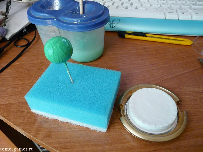 Далее ругаемся на недалеких производителей, которым приспичило писать дату годности прямо на нужной нам крышечке! А ведь могло так красиво получиться, и даже объемно! Берем акрил, красим. Заодно красим резиновый шарик в зеленый.