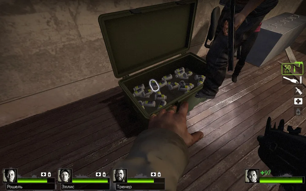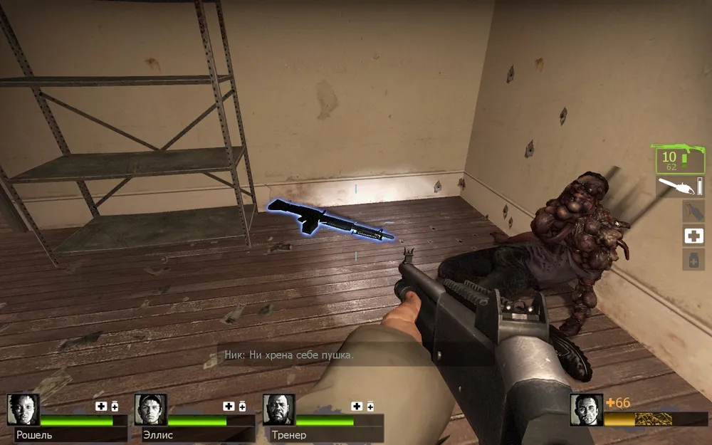 или М_:) (набираем капсом). Опасная вещь в руках неумелых. Стреляет без перезарядки, разрывает Зараженных на куски. Загрузите разрывные патроны (а так можно), получится ещё больше мяса.Вот она...*пускает слюни*