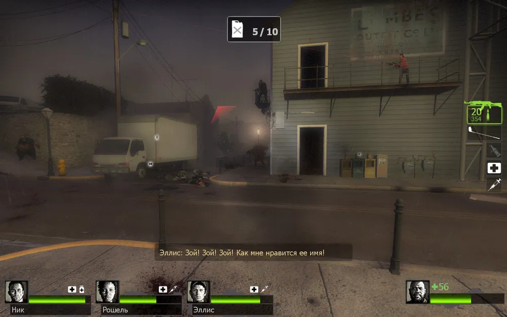 Честно признаться такое чувство сложилось, что в этой кампании Зои отрастила себе яйца не хило возмужала. Причем Эллису она очень сильно понравилась, о ней он только и орет в последней главе. На что Ник отвечает "Смотри и учись Эллис. А что? Я мачо", но Рошель затыкает его вовремя.