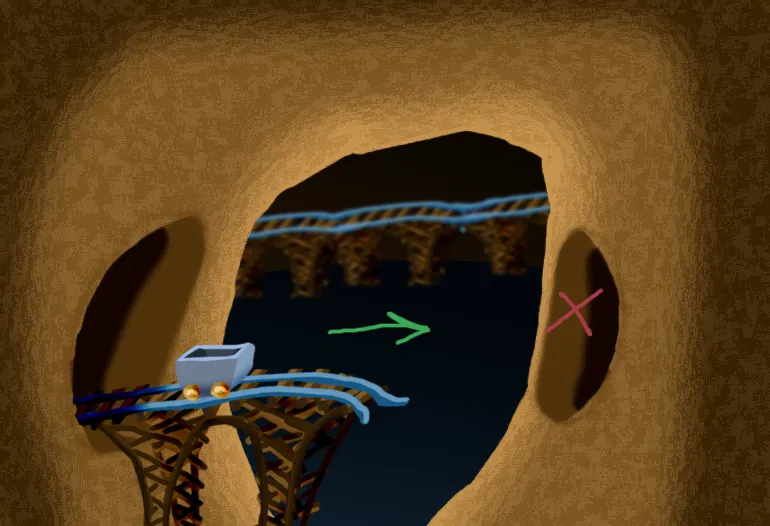 У главного героя есть шахтёрская вагонетка. Разогнав эту колымагу, по старым путям, он планирует перемахнуть в туннель на противоположной стене. Однако туннель заблокирован. Почему он заблокирован, остаётся на ваше усмотрение. Возможно он завален, заколочен, зарос, или ещё чего.