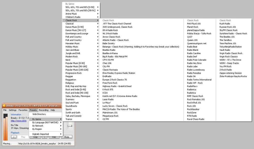 В пункте меню Presets уже есть категоризованные ссылки на радиостанции самых разных стилей и направлений, жанров, поджанров музыки на любой вкус. Послушайте случайные радиостанции, отметьте понравившиеся, чтобы возвращаться к ним снова, и слушайте другие!