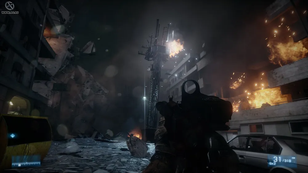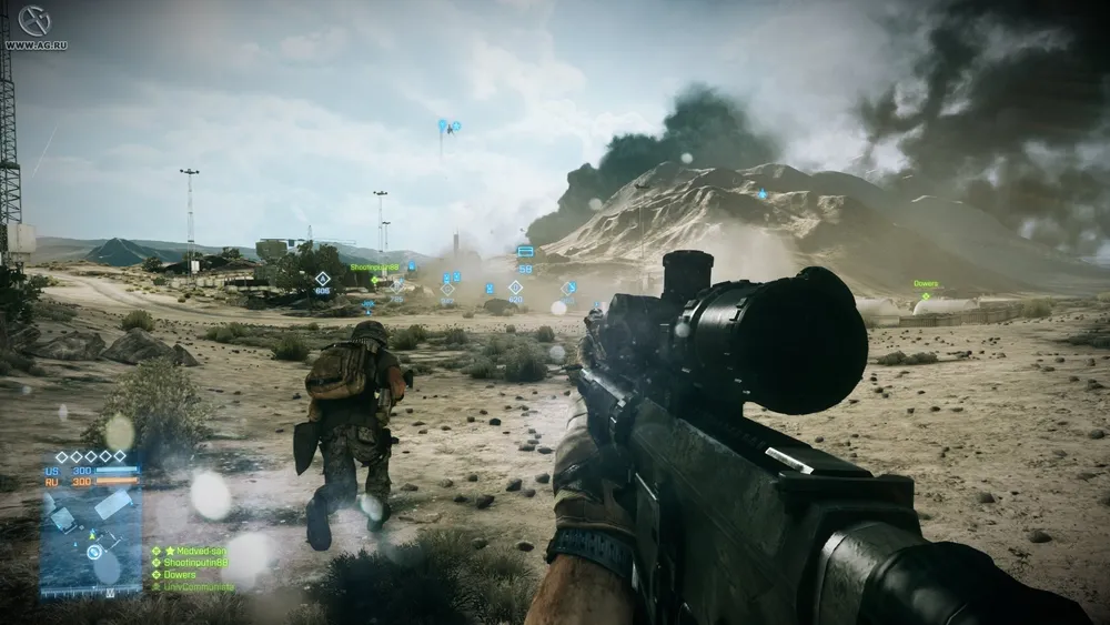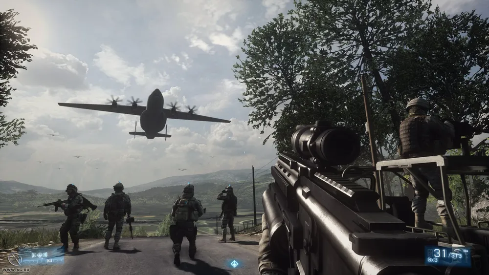 Вот плавно перешли и к главной составляющей Battlefield 3 — мультиплеер. Стандартные режимы: обычный бой между командами, захват радиопередатчиков и захват флагов (точек на карте). Тут Frostbyte 2 разворачивается в полную силу: для примера возьмём карту «Каспийская граница». Карта огромная, на ней присутствует радиоантенна, холм, бензоколонка, аэропорт, лесная поляна, КПП на дороге и другие точки захвата. Причём, чтобы добежать на своих двоих из одного конца карты на другой, потребуется около 3 минут реального времени, в условиях боя о пешем путешествии и вовсе стоит забыть — или задавят на джипе или банально пристрелят с соседнего холма.