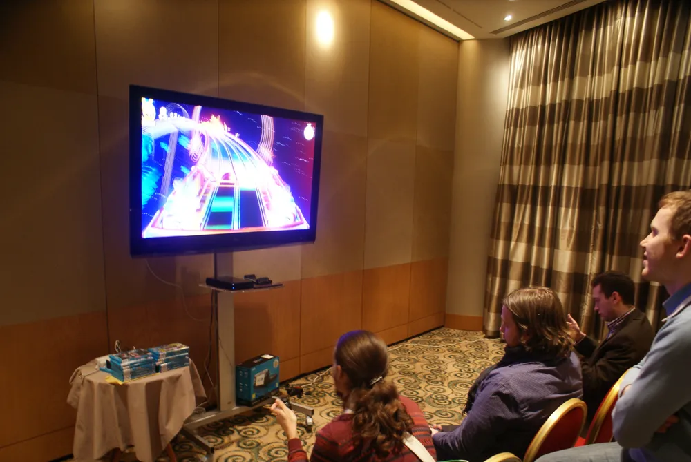 На презентации была представлена черная консоль из комплекта Basic Pack и десятки игрушек на любой вкус и цвет: Mass Effect 3, Darksiders II, FIFA 2013, Assassin’s Creed III, Rabbids Land (хит дня наравне с Super Mario), Zombie U, Just Dance 4 и так далее. В большинстве случае мне приходилось довольствоваться скромной ролью зрителя – места возле консолей никогда не пустовали, но несколько раз оттяпать геймпад c контроллерами я таки умудрился. Как я уже говорил выше, Wii U GamePad – вещица весьма удобная, хотя и требует некоторого периода адаптации. Но вот пульты Remote и “нунчаки” являются настоящим страданием для тех, кто ранее не держал их в руках. Даже я, будучи обладателем старушки Wii, ругался на чем свет стоит. Больше всего проблем возникает при игре в шутеры, что я уяснил на примере Call of Duty: Black Ops II и Zombi U – управлять движением персонажа с помощью “нунчак” и одновременно целиться контроллером очень и очень сложно. Там не час, не два и не три привыкать потребуется, а гораздо больше. К тому же сенсоры подчас срабатывают с задержкой, что раздражает еще сильнее. Хотя спасение есть, и название ему – геймпад Wii U Pro. Но лучше уж научиться управляться с базовыми контроллерами – когда к ним привыкаешь, то начинаешь испытывать самое настоящее удовольствие от игрового процесса.