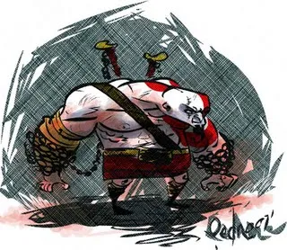 Чтобы было понятно, что Кратос не холеный мальчик, а истинный воин создатели наградили его шрамами - один рассекает правый глаз, а другой красуется на животе. Спиралевидная красная татуировка берет свое начало под левым глазом, нежно растекается по лысой головушке, плавно переход на торс и оканчивается на левом предплечье. И так пугающую внешность украшает еще и эспаньолка, в народе именуемая козлиной бородкой.