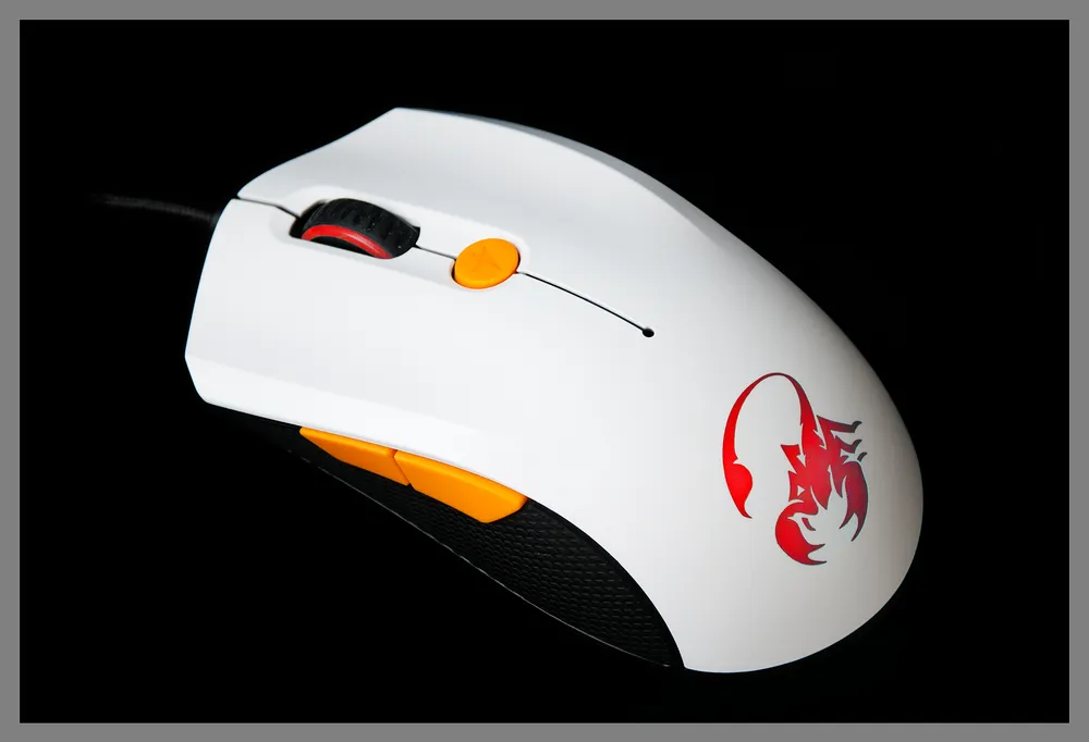 Извлекаем мыша из вкладыша, куда тот помещается вместе с двухметровым шнуром. Визуально он производит однозначно положительное впечатление – симпатичная и аккуратно сделанная вещь. Тактильные ощущения от прикосновения тоже приятные – гладкий, но не скользкий, а словно нежно-шелковистый пластик сверху, прорезиненные, в меру шершавые бочка (покрытие SoftTouch). Внешность у доставшейся конкретно мне особи не броская, но тем не менее способна привлечь внимание: белая спинка (кстати, совершенно не маркая), черные бочка и пузико, черное же колесико со светящимися полосками по бокам (цвет подсветки указывает на текущее значение dpi), оранжевые дополнительные кнопки (одна верхняя и две боковые) и скорпион в атакующей позиции – маскот линейки GX Gaming – на задней части спинки. Скорпиоша, между прочим, тоже светится, и когда мыш подсоединен к ПК, но не используется, мигает попеременно семью цветами – красным, оранжевым, насыщенным желтым, зеленым, голубым, синим, бордовым. При обнаружении движения подсветка маскота автоматически отключается.