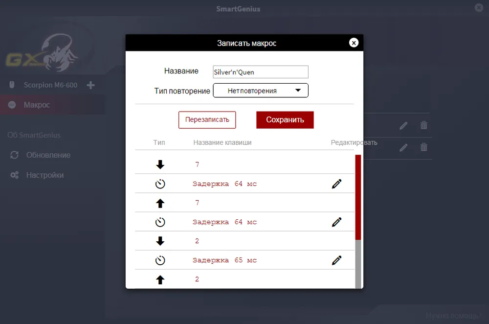 Каждая уважающая себя игровая мышь поддерживает настройку с помощью софта. Scоrpiоn M6-600 не исключение. Нужное приложение, позволяющее подогнать девайсы из линейки GX Gaming под себя любимого, называется SmartGenius и без проблем скачивается с официального сайта торговой марки. В инсталлятор на данный момент вшиты только китайский и английский языки, но в саму прогу русский уже завезли. Интерфейс у нее интуитивно понятный, и освоить ее под силу даже школьнику. С помощью SmartGenius можно создавать свои собственные профили, каждый из которых будет привязан к тому или иному приложению, и записывать макросы. Изначально в нее уже вшит один профиль, называемый Общим и по умолчанию используемый для всех имеющихся на вашем ПК программ.