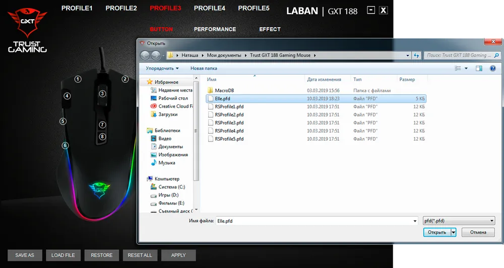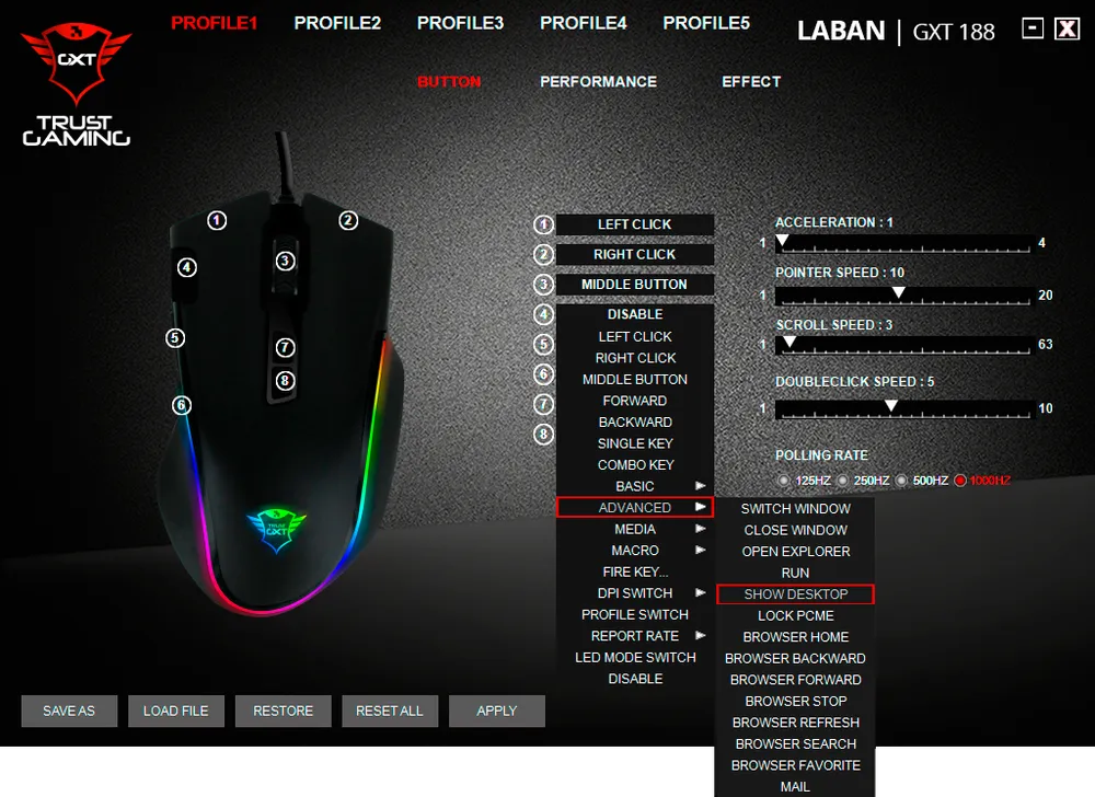 Сегодня сложно представить себе геймерский девайс без соответствующего программного обеспечения. И GXT 188 Laban RGB не исключение. Скачиваемый с официального сайта производителя Trust Gaming Mouse Driver содержит весь джентельменский набор функций и возможностей, который просто обязан быть у любой игровой мыши – программируемые кнопки, настраиваемая подсветка, изменяемые параметры работы датчика и движения курсора. Само ПО на данный момент поддерживает только английский язык, однако проблема языкового барьера, коли таковой имеется, в значительной степени решается с помощью скачиваемого с того же официального сайта руководства пользователя.