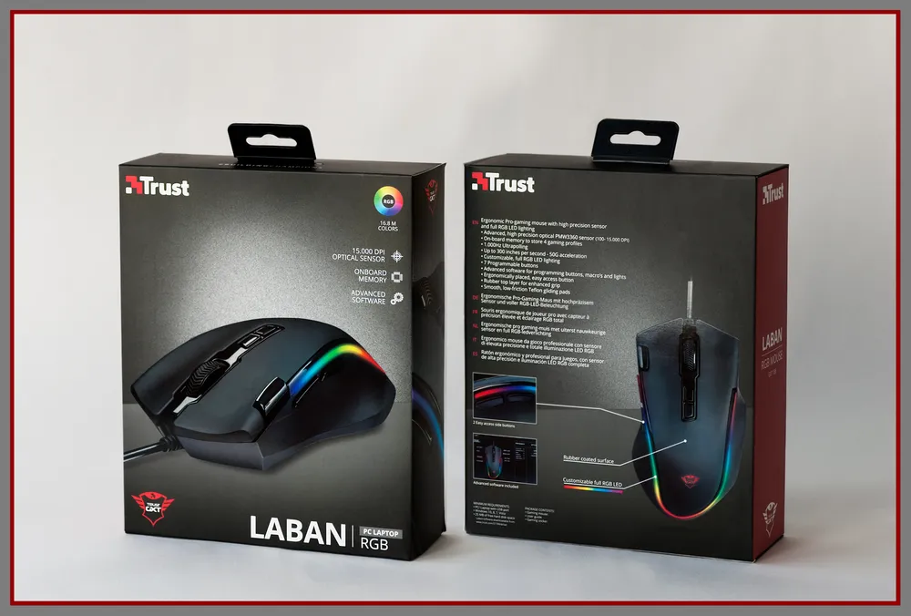 Laban поставляется в слипкейсе из плотного и прочного картона с качественной полиграфией и оформлением в едином для всех устройств Trust Gaming стиле. На лицевой стороне упаковки изображена сама мышь, указывается название модели и кратко перечисляются ее основные достоинства – RGB подсветка, оптический сенсор с разрешением до 15 000 dpi, встроенный чип памяти и продвинутое программное обеспечение. На задней стороне тоже приводятся технические и дизайнерские особенности прячущегося внутри девайса, причем в более подробной форме, но исключительно на английском. Единственная мультиязычная фраза на упаковке – описание модели как эргономичной профессиональной игровой мыши с высокоточным датчиком и полноценной светодиодной подсветкой.