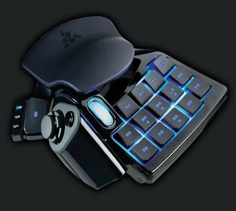 Игровая миниклавиатура Razer Nostromo с эргономичной формой для левой руки имеет 16 полностью программируемых клавиш, 8-позиционный D-Pad для большого пальца, съемный джойстик и колесо прокрутки. Неограниченная длина макросов и возможность хранения до 20 различных игровых профилей.