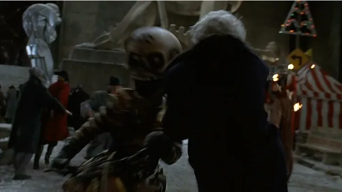 Каменная кладка завершается, елка несколько позади. Улица меняет интерьер – перед нами снежные деревья, и готическая ограда. Свет от фонарей иногда мигает, погружая в полумрак сцену.
