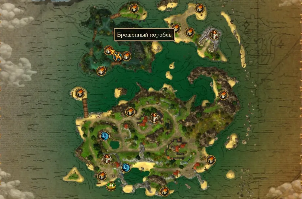 Пиратских кораблей вокруг них нет, можно спокойно собирать сундуки. На берегу у места первой высадки вас встретит гоблин, мечтающий о том, чтобы все окружающие принимали его за пирата. Сначала приносим ему птицу, которую довольно легко найти.