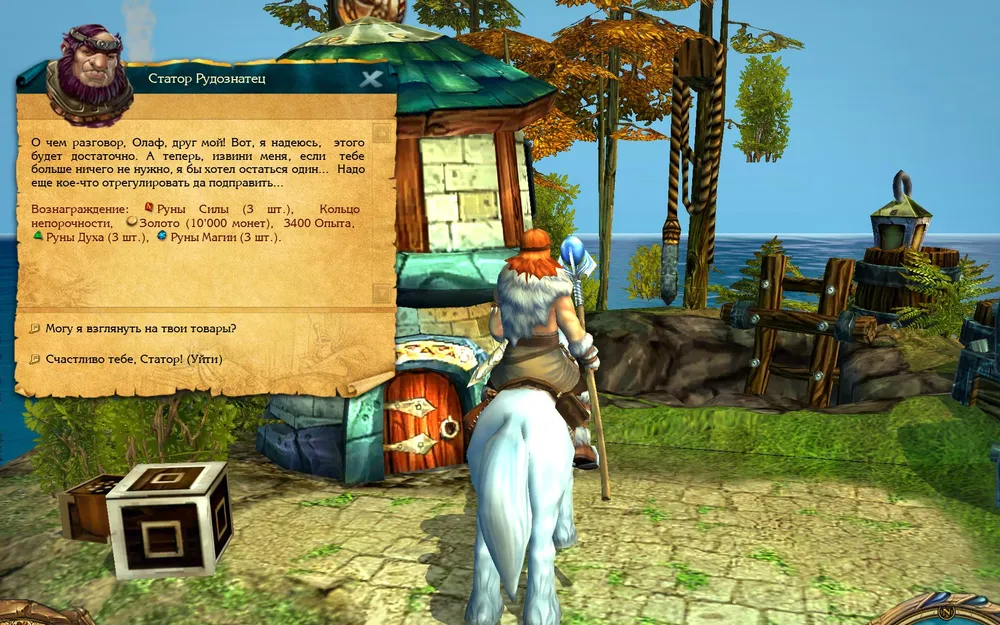 Первым делом направляемся к механику Статору Рудознатцу, живущему на отдельном островке, и узнаём, что для завершения работы над его новой машиной необходима шестерёнка. Последняя покупается в лавке Гутора, на большом острове. Шестерёнка - это великолепно, но теперь Статору нужны чертежи. Отправляемся в Демонис, к секретарю Ксеоны, Хексусу, и выкупаем их у него.