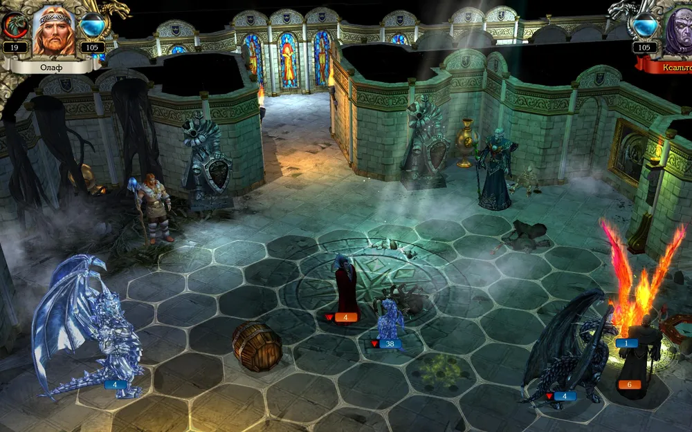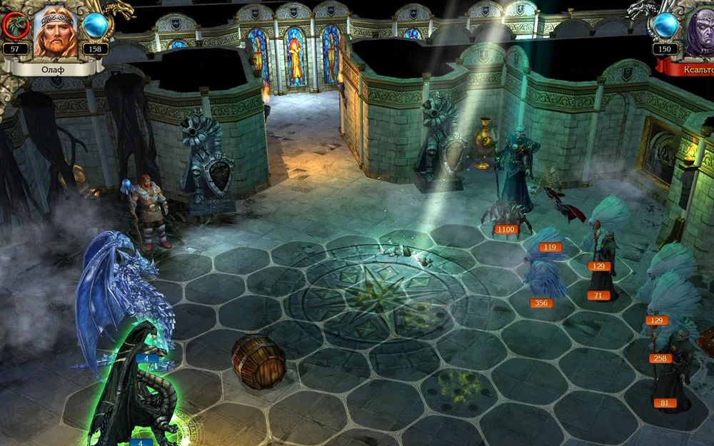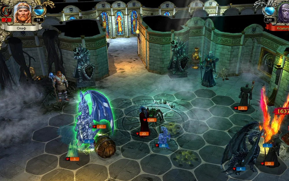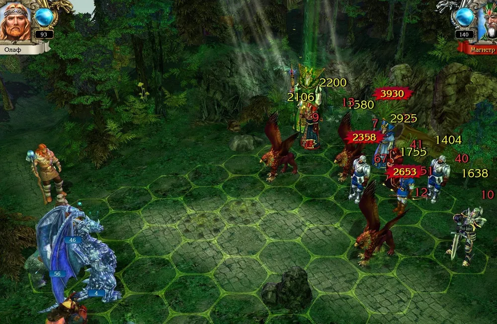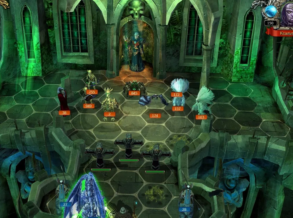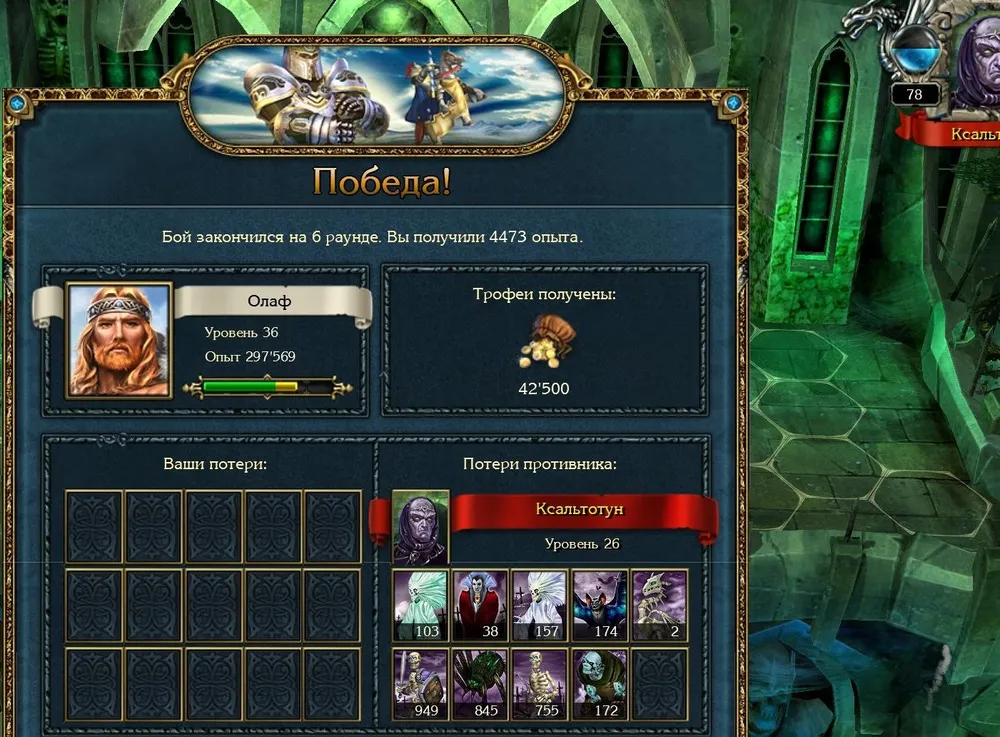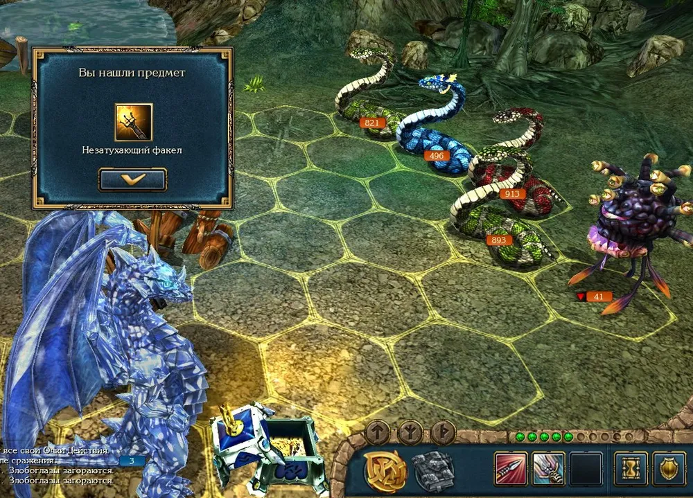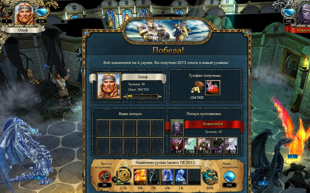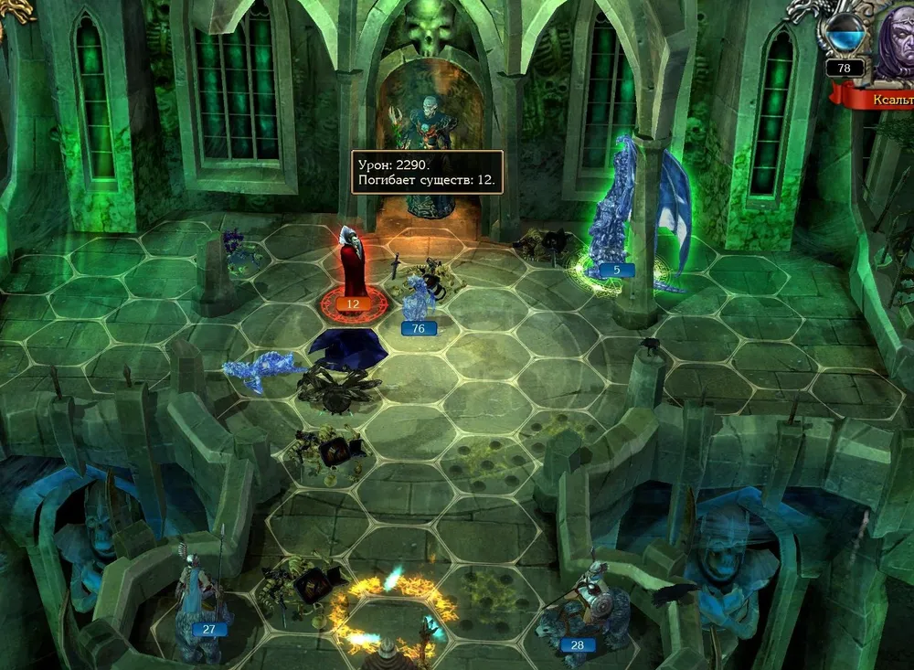 Позднее я всё же начал игру со старого сохранения, до боя с Ксальтотуном. Пришлось повозиться: Ксальтотун-призрак упорно применял «Гейзер», невидимые красные драконы несли потери. Выставил ледяных – «Гейзер» не появлялся, но по красным ударила «Ледяная змея». Убрал в резерв красных, нанял чёрных (первый их выход на поле боя): дело пошло.