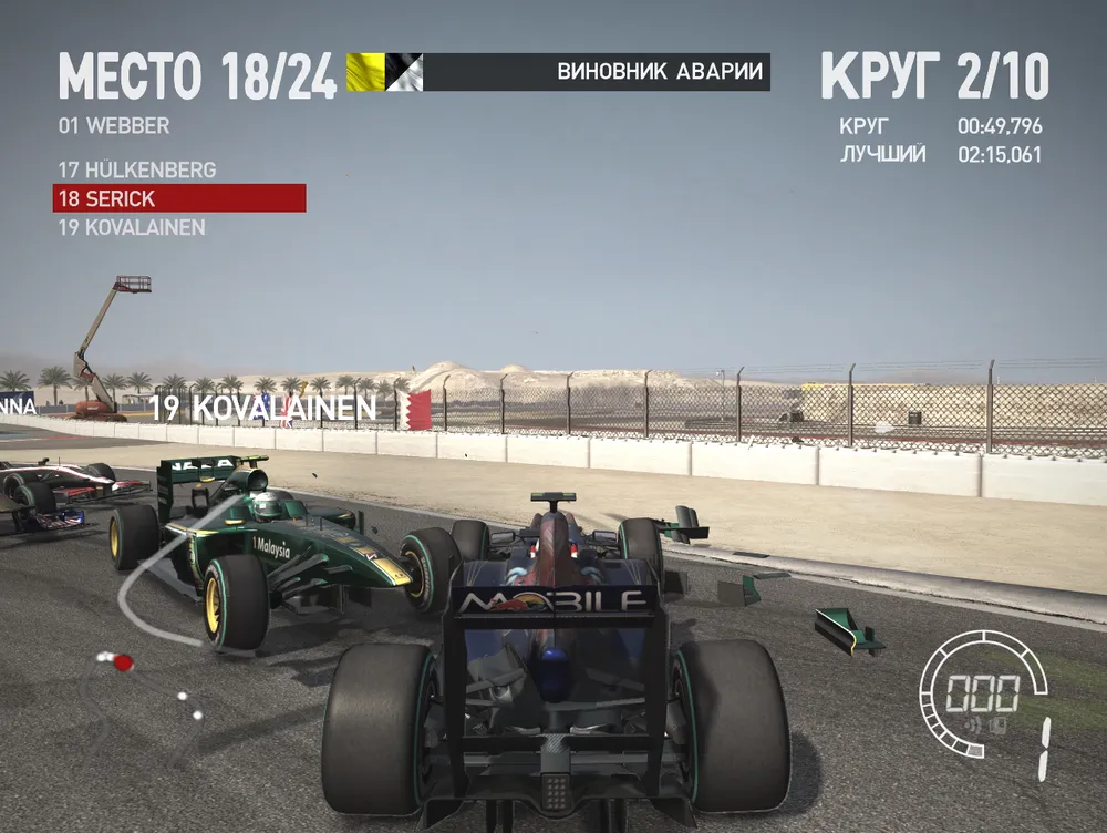 И вот мы, наконец, уже официально выезжаем на трассу. Десятки «Формул» уже заняли свои позиции, пилоты ждут объявления старта гонки. И именно тут F1 2010 предстает перед игроками в наилучшем свете: неутешимый рев быстрейших машин, который до этого только раздражал; жаркое солнце, заставляющее реветь двигатели от перегрева. Нужно срочно давить на газ, ибо уже кажется, что все вокруг начинает плавиться. Но вот «Формулы» стартуют с мест, а нам, пилотам-новичкам, нужно хоть как-то разобраться в этом хаосе. Мне удается удачно влиться в толпу и оказаться на 14-ом месте, а это, скажу я вам, очень неплохой результат. Но опыт в итоге свое отыграл: не рассчитав скорость, мой болид вылетает с трассы и на огромной скорости врезается в ограждение. Крах движка и подвески... Поверьте, эмоции, которые дарит игра на первых порах, просто непередаваемые, такого, лично я, не испытывал уже давно.