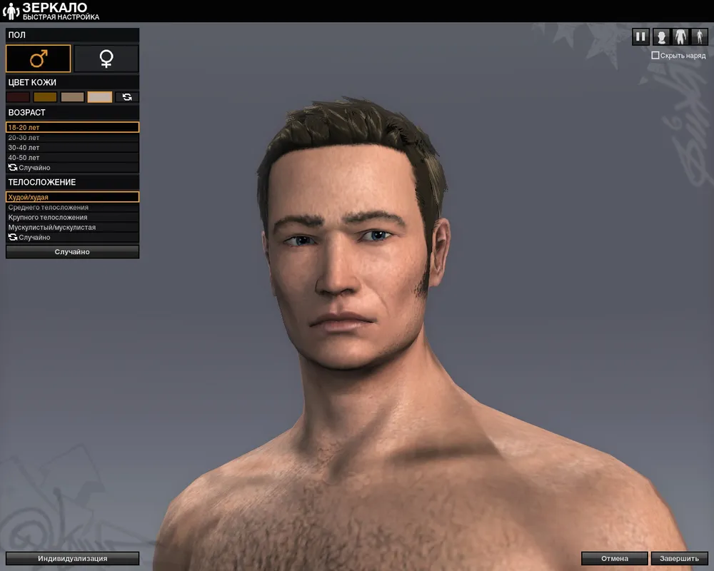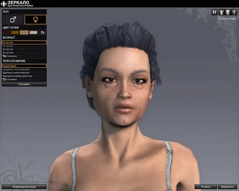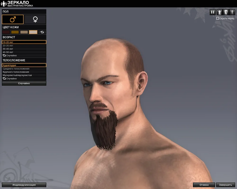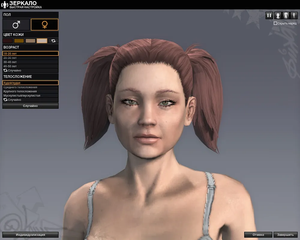 Процесс создания персонажа на первый взгляд прост и незамысловат, Вам предлагают выбрать цвет кожи, пол, возраст и телосложение Вашего будущего персонажа и нажать кнопку случайно. Щёлкайте, пока не удовлетворитесь результатом, как говорится, а потом нажимайте клавишу "Индивидуализация" для более тонких изменений внешности вашего будущего миньона.