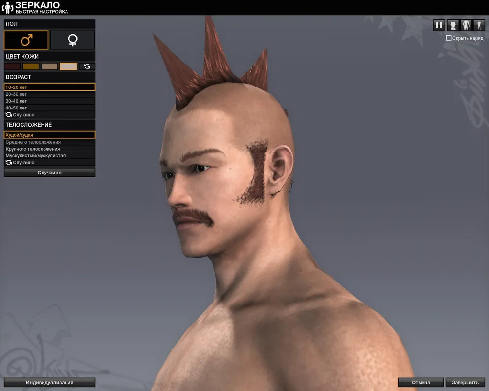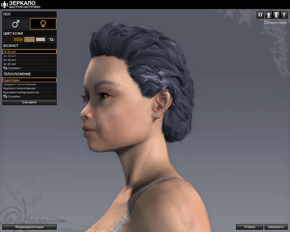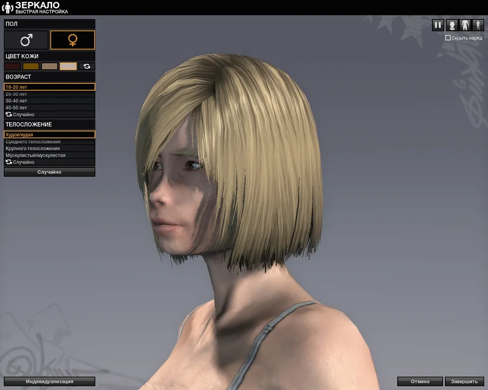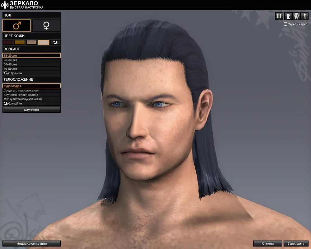 Процесс создания персонажа на первый взгляд прост и незамысловат, Вам предлагают выбрать цвет кожи, пол, возраст и телосложение Вашего будущего персонажа и нажать кнопку случайно. Щёлкайте, пока не удовлетворитесь результатом, как говорится, а потом нажимайте клавишу "Индивидуализация" для более тонких изменений внешности вашего будущего миньона.