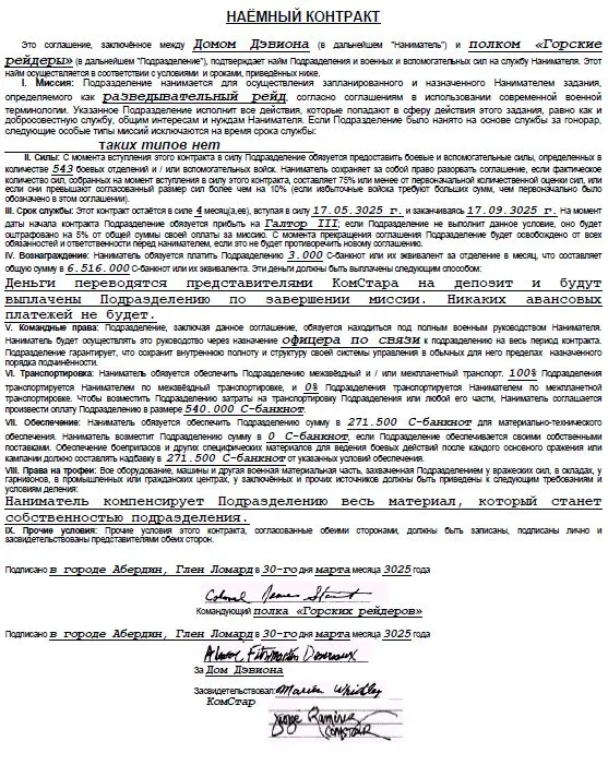 Однако подавляющее большинство наёмных команд рассматривают контракт как простое деловое соглашение. Условия оговорены и выполняются, а любое нарушение нанимателем, специальное или случайное, предполагает изменение контракта или его аннулирование (Комиссия по надзору и сотрудничеству с наёмниками сформирована как раз для решения подобных происшествий; см. с.25).