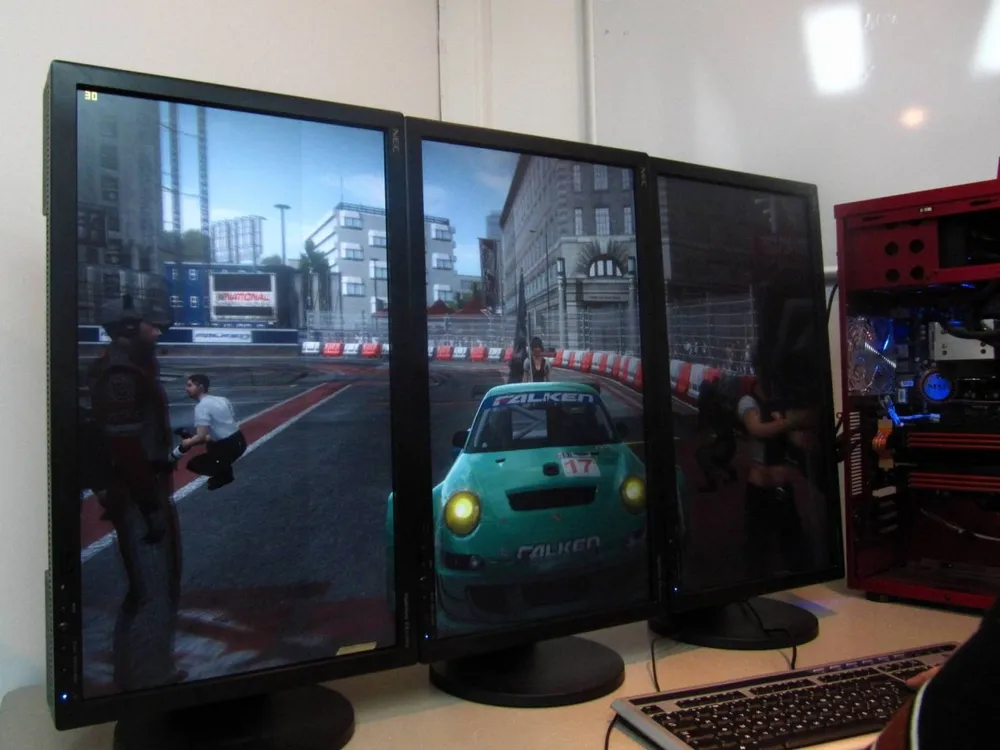 Итак, эту технологию кроме самой AMD представляли процессор AMD Phenom II X5 975 (кто бы сомневался!) с 4 GB ОЗУ, две видеокарты AMD Radeon HD 69502x2 ГБ и три монитора 23" NEC EA231WMiс разрешением 1920 на 1080 каждый. Таким образом общее разрешение этого виртуальгного мегамонитора составило 3240 x 1920.