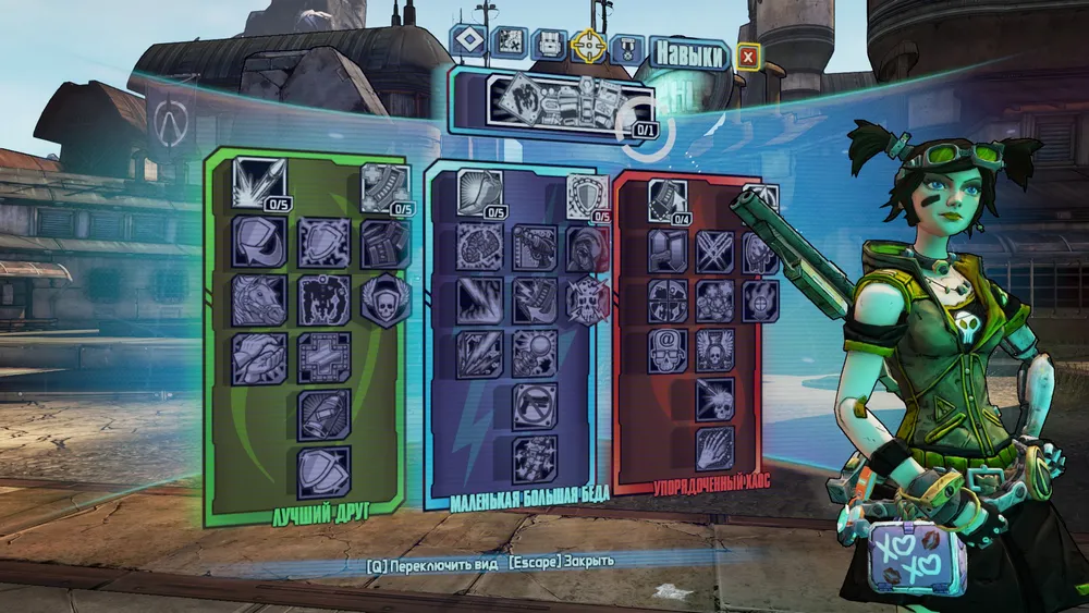 Повысить силу атаки на дальних дистанциях и в рукопашной схватке можно благодаря навыку “Анархия”. За убийство каждого противника, а также после опустошения магазина даются очки анархии, увеличивающие наносимый Гайкой урон. Очень полезный навык, но при этом весьма специфический. Сила атаки хоть и повышается, зато существенно снижается меткость. Чем больше очков анархии скапливается у Гайки за пазухой, тем выше шанс, что она промажет – настоящая беда при использовании снайперской винтовки, к примеру. Тем не менее на ближней дистанции навык весьма действенен. Повысить планку получаемых анархических очков и обзавестись дополнительными бонусами (получить, к примеру, сразу два или три очка вместо одного) можно при помощи таких навыков как “Наномикрокиберпанк”, “Типовой иконоборец” (отсылка к Пусям?) и “Рациональный анархист”.