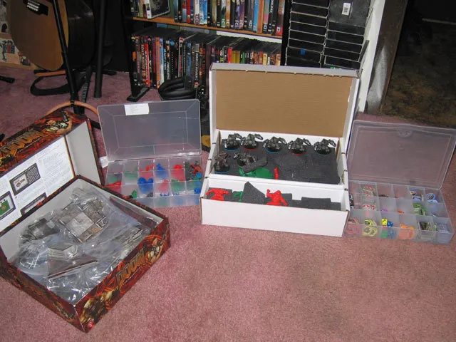 Двери, представлены картонными значками, зажатыми в пластиковые подставки, что смотрится очень гармонично рядом с пластиковыми фигурками. Разложенная игра не может не вызвать восхищения. У мальчиков-подростков в буквальном смысле потекут слюнки при виде всех этих фигурок и значков, а те из нас, кто любит «игрушечный» формат будут поистине в восторге. Всего же в комплект игры входит так много различных компонентов, что все они с трудом влезают в коробку. Поэтому я использую коробку из-под рыболовных снастей для хранения мелких деталей, а в оригинальном боксе держу только части игрового поля и больших монстров. Это занимает больше места на полке, но зато сильно помогает игроку-захватчику быстро подготовить все необходимое для игры.