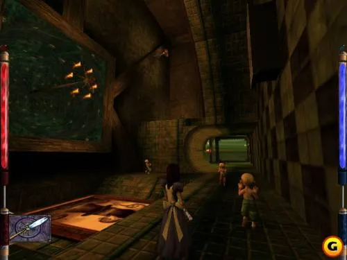 Там концертный зал, смотрим красивый ролик с больными детьми, в ходе которого гном объясняет нам, что делать дальше, в конце ролика в комнату влетают стражники бубна. После потасовки со стражниками у нас в этом зале есть ещё одно дельце, идём к двери, там, в нише рядом с дверью есть изображение кричащей рожицы. В нее следует метнуть ножик, проследите, чтоб она нажалась, выходя из концертного зала, видим ролик, в котором гном открывает потайную дверь в библиотеке. Идём снова наверх, но на сей раз сворачиваем вправо, идем в дверь, вот она, библиотека,