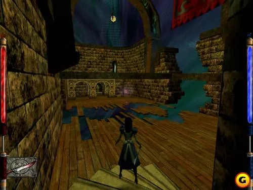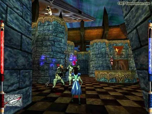Итак, нас забросило в маленькую комнатку, из которой можно попасть в зал живописнейшей архитектуры. Впереди Вас подстерегают стражи. Всё, что от вас требуется – пересечь зал и войти в дверь напротив, но есть и небольшая ловушка, приманка в которую выглядит, как красивый красноватый сосуд, висящий в воздухе. Это Эликсир ярости, после его применения Алиса становится страшной на вид: вырастают рога, шипы и прочее, вокруг Алисы появляется еле заметное красное свечение. Но после, того, как Вы возьмёте бонус, со всех сторон сбегутся стражники. Итак, пересекли зал, выходим в следующую локацию. Пропасть, две платформы, для простого уровня: соединены мостом. Для более сложных – прыгающие плиты. Итак для тех у кого плиты прыгают, несколько полезных советов.