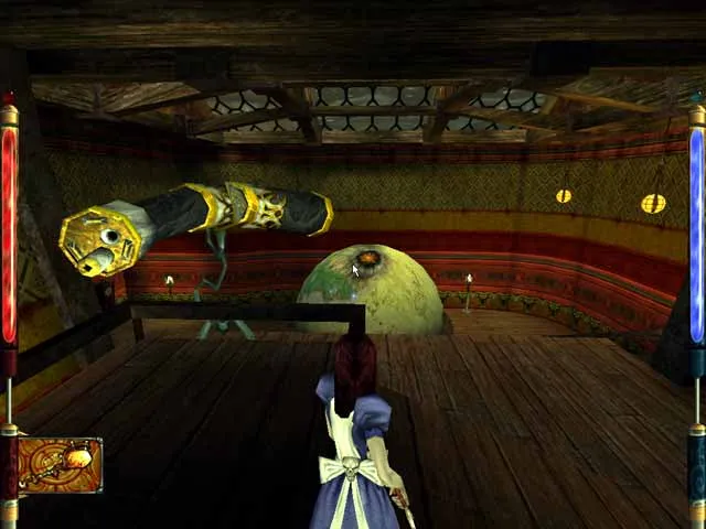 Мы стоим в «небольшом» зале с лестницей, что извивается вокруг монументальной, безвкусной колонны. Вокруг этой колонны летает Боджум, будто ужаленный. Также по лестнице шастают два стражника, идём влево, к двери с белыми фонариками, спускаемся вниз по лестнице, вы оказываетесь напротив платформы с Демоническими костями. Очень капризное оружие состоит из трёх компонентов, что должна собирать Алиса на протяжении всей игры, есть только одна атака, при которой производится вызов одного из трёх демонов, если у Вас только один компонент, Вы можете вызвать только летающего демона. Летающий демон, слабый противник дальнего боя, атакует молниями, может летать. Осторожно, сразу после того, как возьмёте кости, по Вашу душу прилетят двое Боджумов, что попытаются столкнуть Вас с платформы. По этому платформу следует покинуть. Под лестницей лежит здоровье.