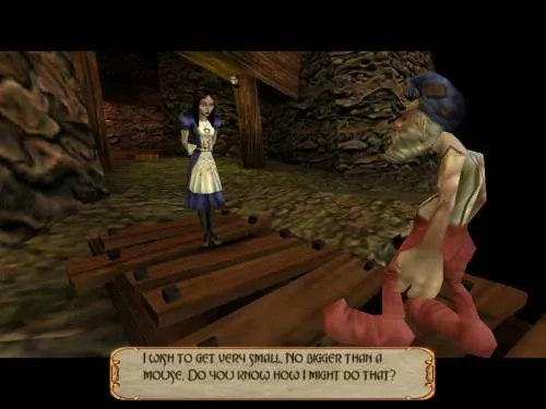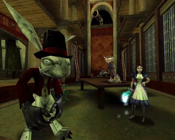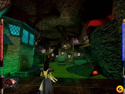 Хватайте эликсир, бегите обратно в «главный» зал. С эликсиром снесёте Боджумов, не заметив. Теперь вверх на второй этаж, в дверь, за ней бдительная стража, можно кинуть им кости и быстренько смыться, потом снова зайти, добить, идём прямо, игнорируя маленькие двери справа и слева.Вламываемся в лабораторию, там уже кипит драка между гномом и двумя стражами. Спасаем гнома, берём колбу с полки, идем обратно в комнату, ту, где две маленькие двери, идём в одну из них, мы на третьем этаже. Идём в одну из больших дверей, в ту, которая ведёт в просторную комнату с двумя стражами бубна. Там, если подняться по ступенькам на небольшой помост, видим клюшку для крокета. Идём в следующие двери, попадаем в теплицу, бежим к клумбе с полосатыми грибами, там выливаем зелье гнома, получаем леденец на палочке. Хватаем леденец, идём обратно. В предыдущих комнатах уже сидят враги.