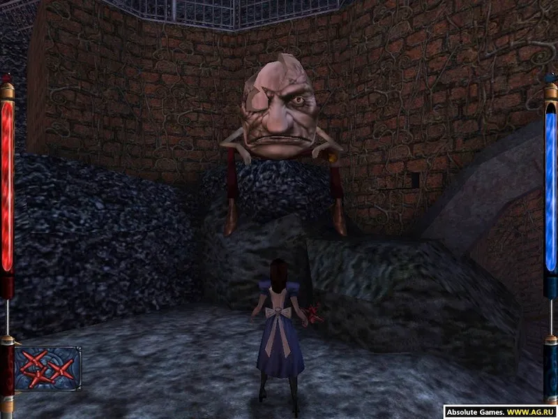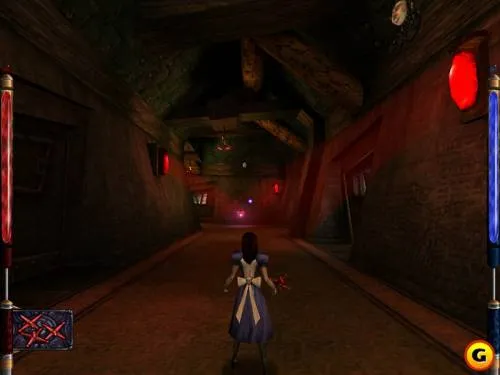 Таких струй пара в игре много, они периодически будут облегчать нам жизнь. Смотрим ещё ролик, где кот объясняет нам, как пополнять здоровье и манну с помощью кристаллов. Идём дальше, забираем кристалл, указанный котом, находим нож. Не бойтесь,помимо ножа Вы не пройдёте, даже при большом желании, ибо находиться он прямо в дверном проёме. Нож - базовое оружие в игре, имеет два способа атаки: основная - обычный удар ножом, альтернативная - кинуть нож. Нож не тратит манну. Далее идём вверх там ещё один ролик, в котором Кролик становиться маленьким и смывается через микроскопическую дверку. После ролика на нас нападёт крестовый стражник , если не хотите с ним разбираться врукопашную, можно запустить в него ножом, повернуться и прыгнуть на платформу, что находиться ниже. К тому времени нож вернется в руку, после этого идём к той дверце, поворачиваем и оказываемся в большом зале, тут столько мостиков и платформ, что с первого раза можно запутаться, но нам не вниз - там зелёная вода, от которой у Алисы падает здоровье. Мы идём вперёд, внимательно смотрим по сторонам, скоро появится Чешир, который укажет дорогу. Будет ещё один ролик с рабочим, смотрим и идём дальше, нам нужно найти табличку «Yur Mine». Опять же нам поможет Чешир. Прыгаем на платформу под табличкой и идём в коридор, на следующий уровень.