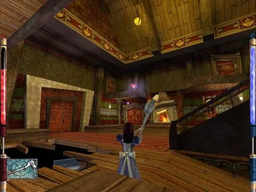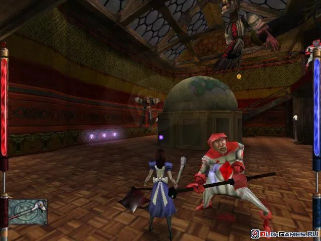 Итак, Алиса в маленькой комнате. По комнате бегает больной ребёнок, что оживляет окружение, а также является идеальной мишенью для отработки ударов, далее идём сквозь дверь, осторожно, с той стороны Вас поджидают стражники бубна, когда расправились с ними, идем вверх по лестнице, сворачиваем влево, оказываемся над камином. прямо перед Вами – балкончик, на котором лежит клюшка для крокета