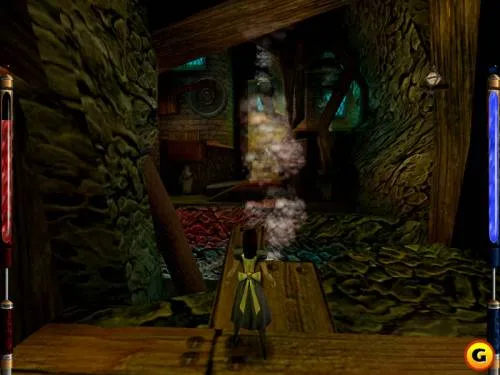 Находимся в чудесном месте: снизу уже знакомая нам зялёная водичка, с потолка свисают верёвки, на другой стороне зала, за решеткой находится портал, но нам не туда. Идём к дымоходу, на нём появиться котик и покажет, как пользоваться верёвками: разгоняемся, целимся точно на верёвку и прыгаем, хватаем верёвку, раскачиваемся, перепрыгиваем на следующую, раскачиваемся и запрыгиваем на платформу, идём к гному.