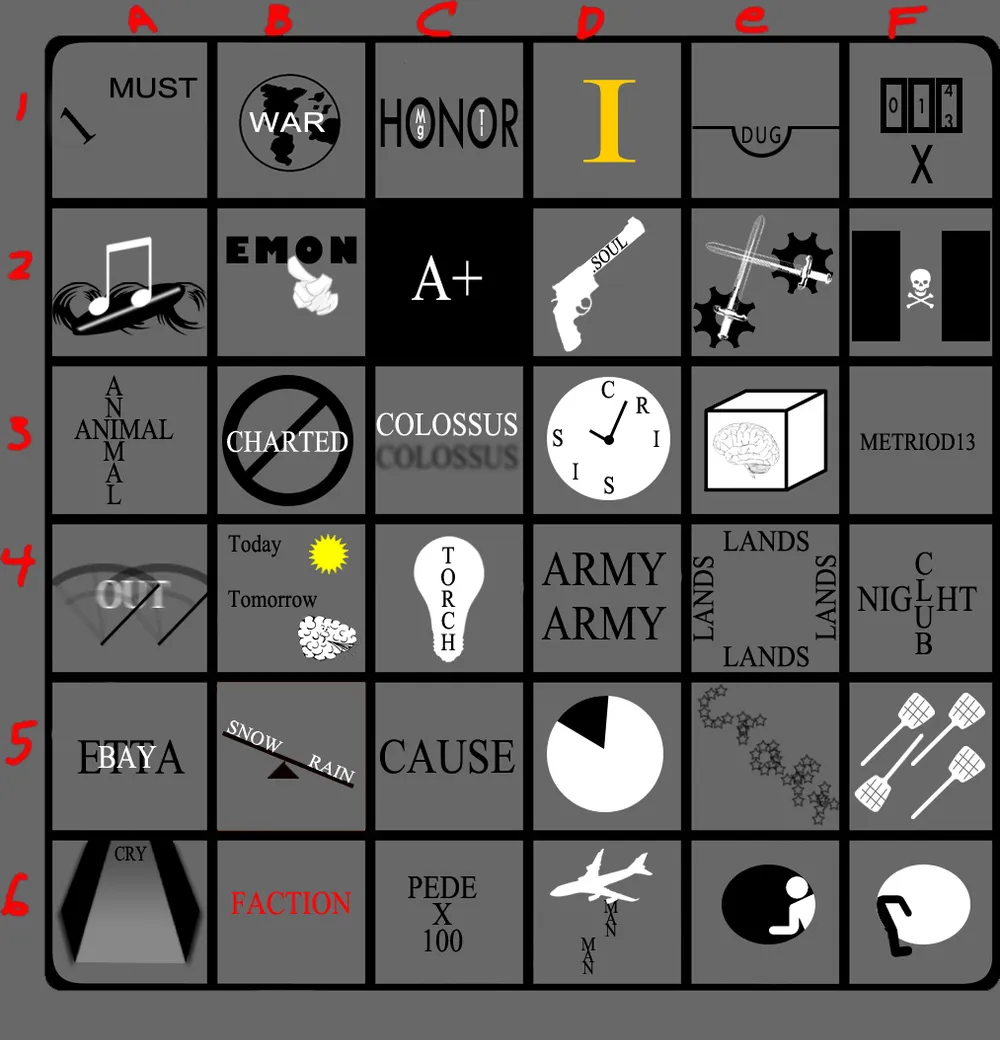 1 картинка 4A - Space invaders 5F - Fruit Slice 6B - Fallout, позорище:) 2 картинка 2F - Dead Space 4E - Borderlands 6D - MOH: Airborne (?) 3 картинка 2E - Sindicate (?) 2F - Lost Planet 3A - Time Shift 3E - Minesweeper 5C - Treasure Iseland 5E - Day of Defeat