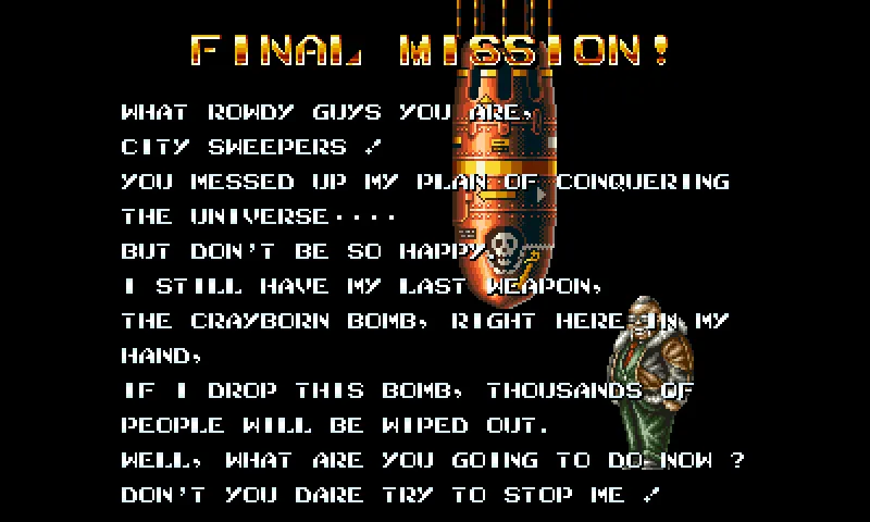 Ещё, практически в конце уровня, вам предстоит сделать тяжелый выбор. Босс будет пытаться скинуть бомбу на город, и если вы ему это позволите, то получите "плохую" концовку.