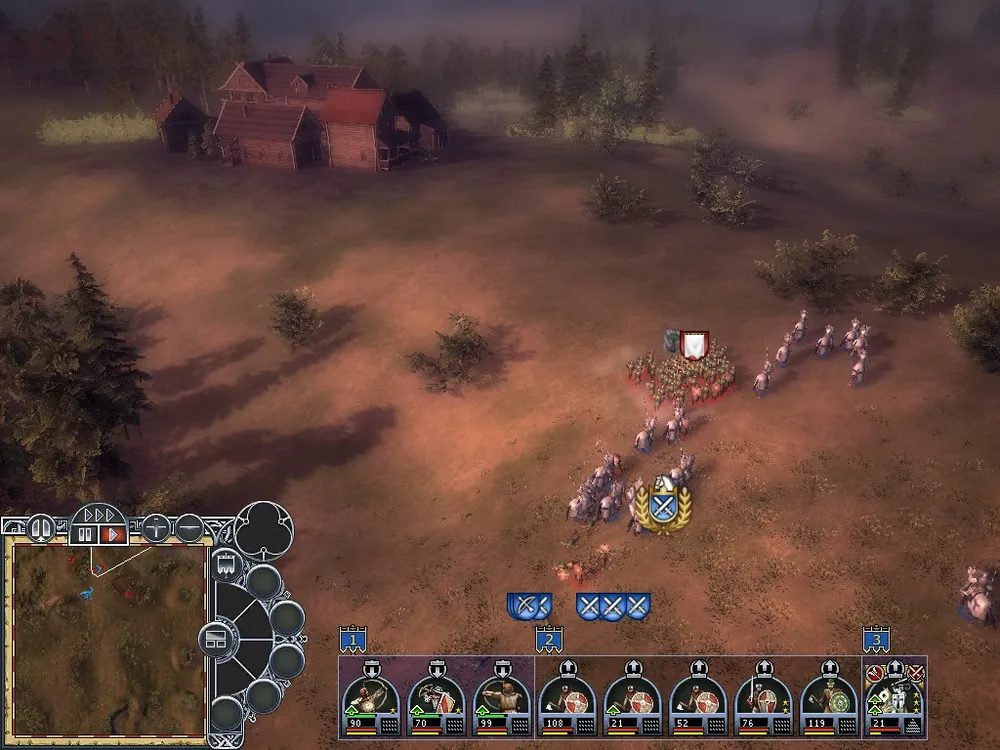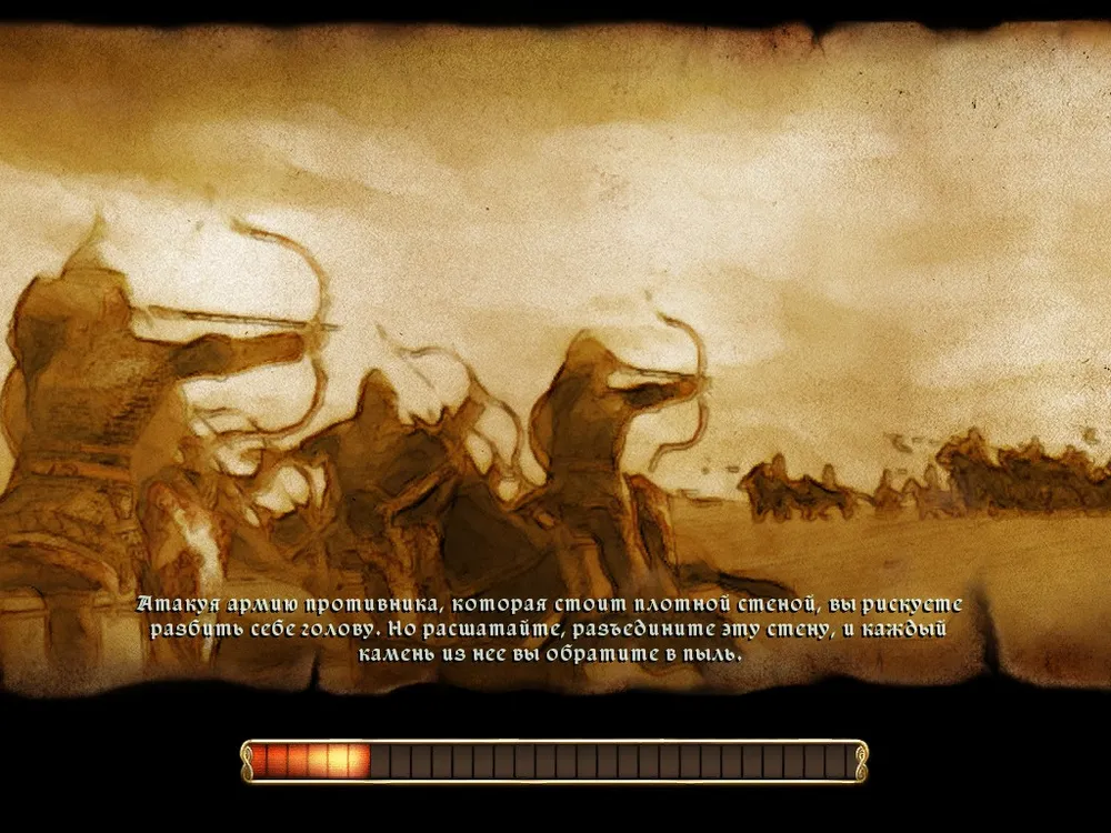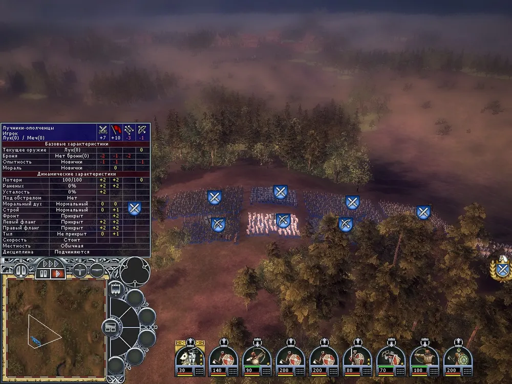 Самое вкусное, что есть в игре – это, конечно же, бои. При первом попадании в бой глаза начинают разбегаться – командная панель богата вариантами. Прошедшие обучение уже в курсе, для чего они нужны (я обучение так и не прошел, даже последние патчи так и не объяснили игре, что широкоформатные мониторы есть не у всех), те, кто играл в «Total War» или «Короля Артура» разберутся сами. При наведении на отряд открывается табличка с его параметрами, любители варгеймов будут довольны. Хотя основных параметров всего четыре штуки, модификаторов к ним полно – учитываются и прикрытые фланги и тыл, и местность, и близость полководца, потери – много чего. Один и тот же отряд в разных условиях может как стоять насмерть, так и броситься бежать, потеряв десятую часть состава.