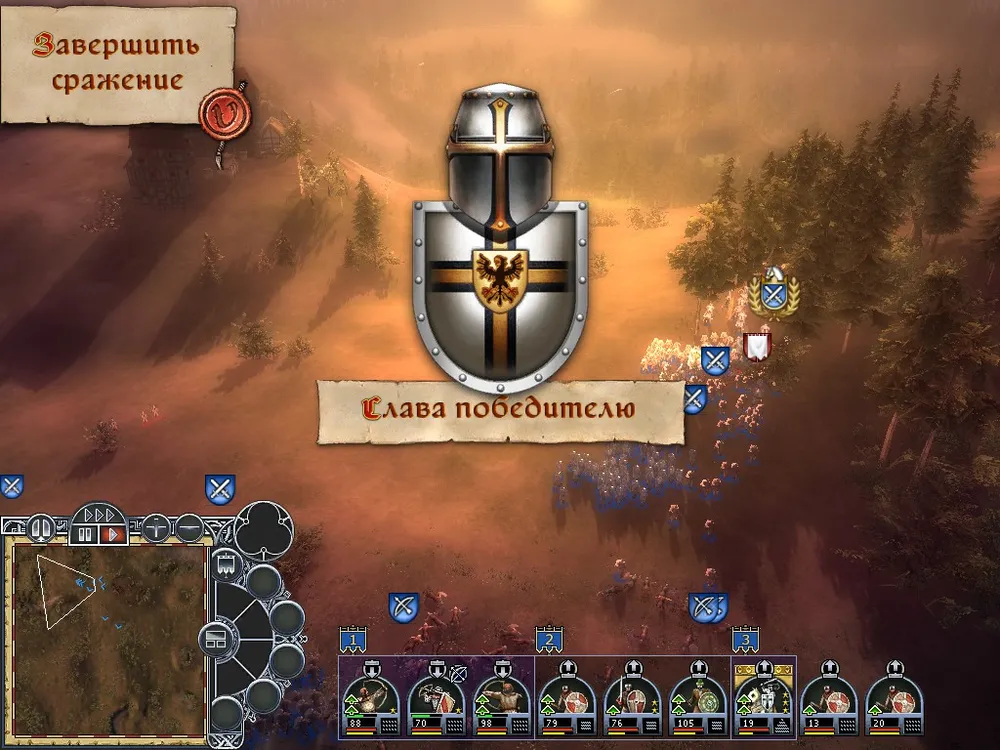 Что удивило – тяжелая конница спокойно разгоняет многократно превосходящие силы легкой, но увязает в бою с лучниками-ополченцами. Попытка прорвать строй сбившейся в кучу легкой пехоты отрядом героя меня привела к загрузке битвы заново. Еще удивило то, что не показан радиус стрельбы, это неудобно.