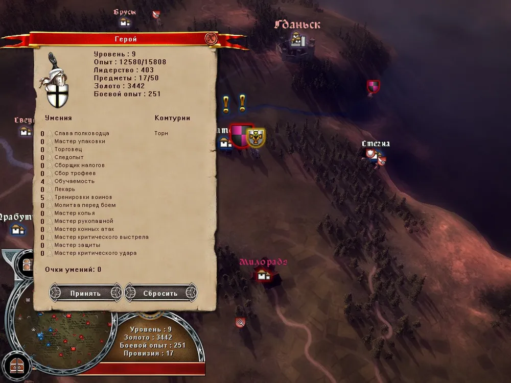 Герой, который герой – это полтора десятка навыков, которые облегчают жизнь. Часть из них позволяет получать больше денег, часть – терять меньше войск, часть – быстрее обучать войска. Впрочем, влияние этих навыков на игровой процесс не слишком велико.