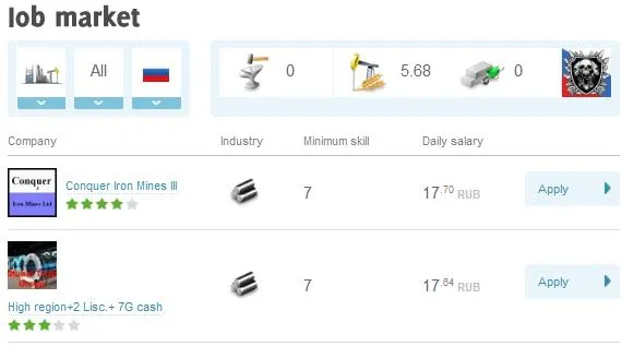 Здесь люди находят работу. Можно выбрать отрасль(мануфактура, добыча, строительство) фирмы, где хотите работать, уровень навыка(0-0.99, 1-1.99 и т.д.), страну(можно работать только в стране проживания). Можно также посмотреть свои рабочие навыки.
