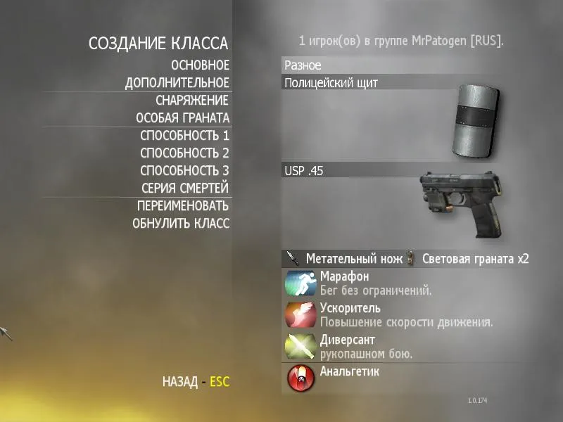 Вместо основной гранаты идет метательный нож. Почему? Ну потому что при определенной сноровке его можно очень метко кидать, а так же можно подбирать с тела поверженных соперников. К тому же метнуть нож быстрее и больнее чем бить щитом.